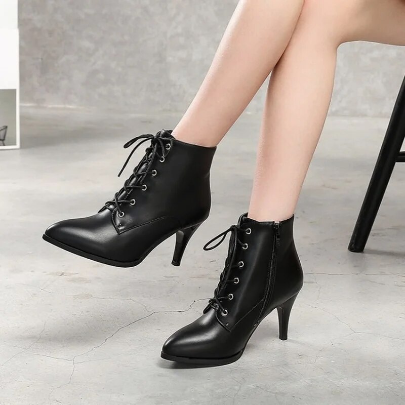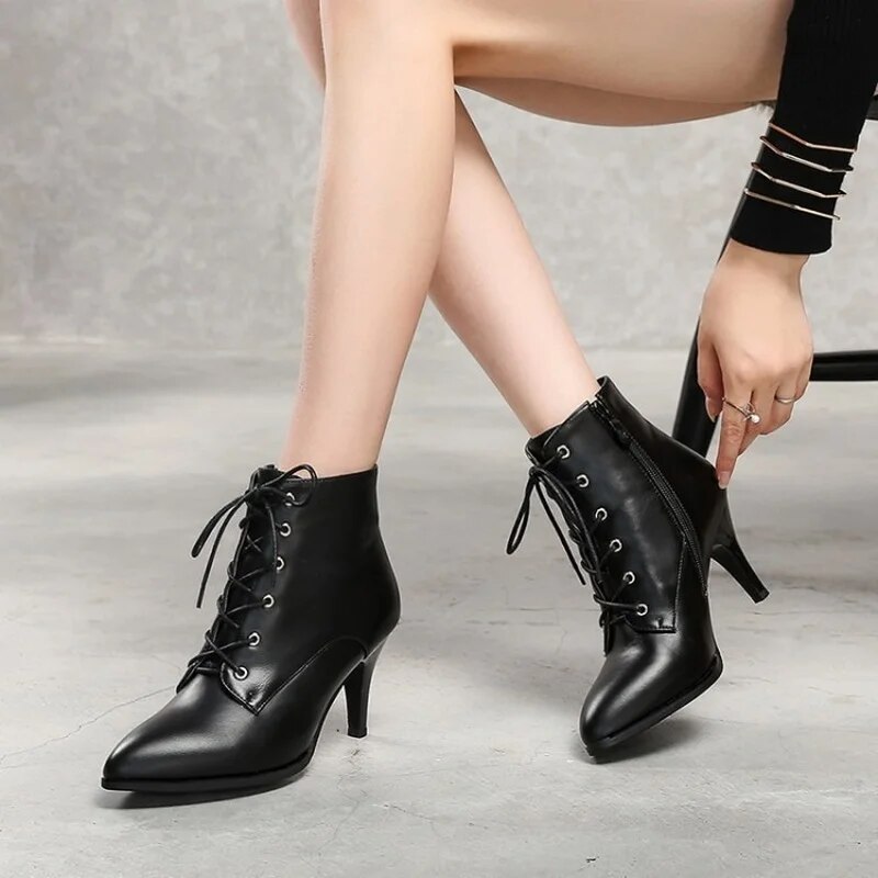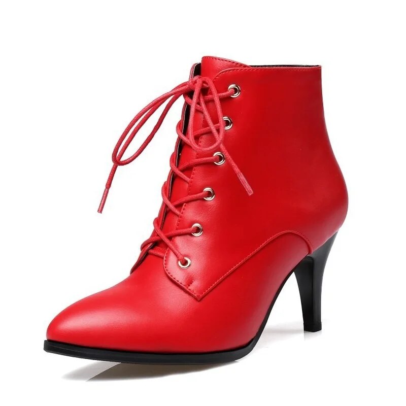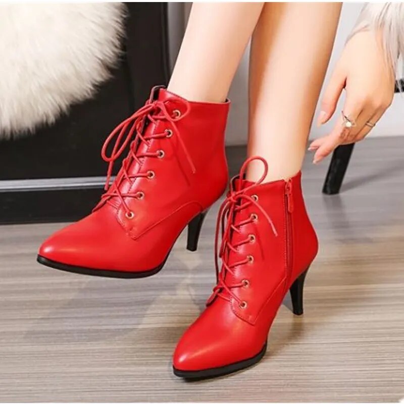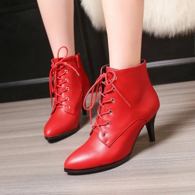 Lace Up Pointed Toe Thin Heel Shoes Lady Red Women Boots Winter Ankle Boots Zipper High Heel Short Boots Big Size