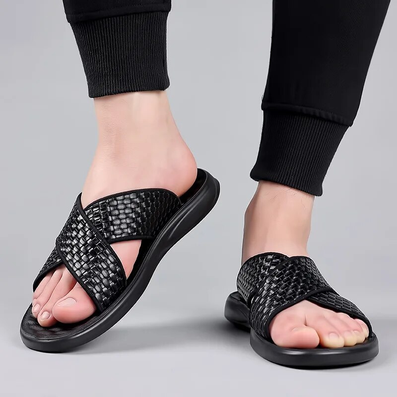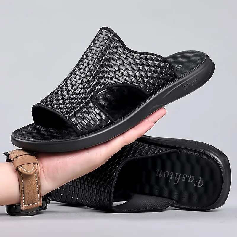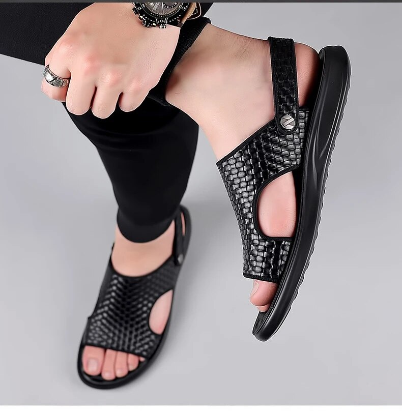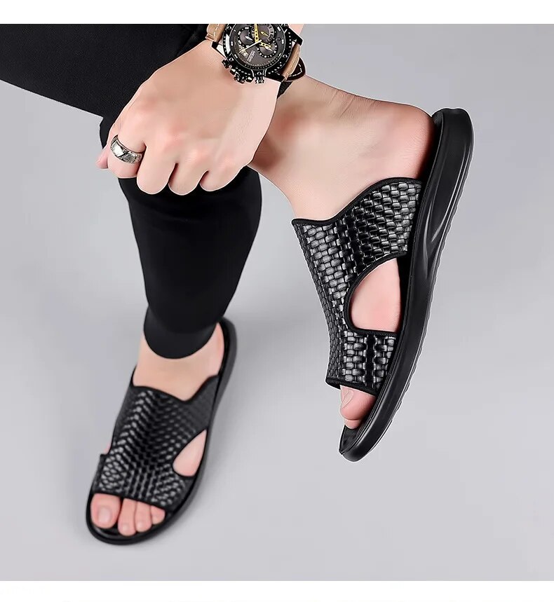 New Shoes For Men Fashion Leather Sandals Summer Fashion Hollow Out Slipper Outdoor Knit Style Beach Shoes
